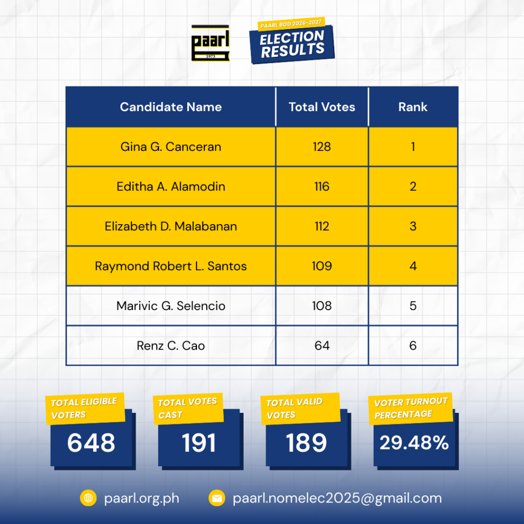 We are pleased to announce the official results of the PAARL Board of Directors elections for the 2026–2027 term. All election returns for this cycle have been duly canvassed and certified