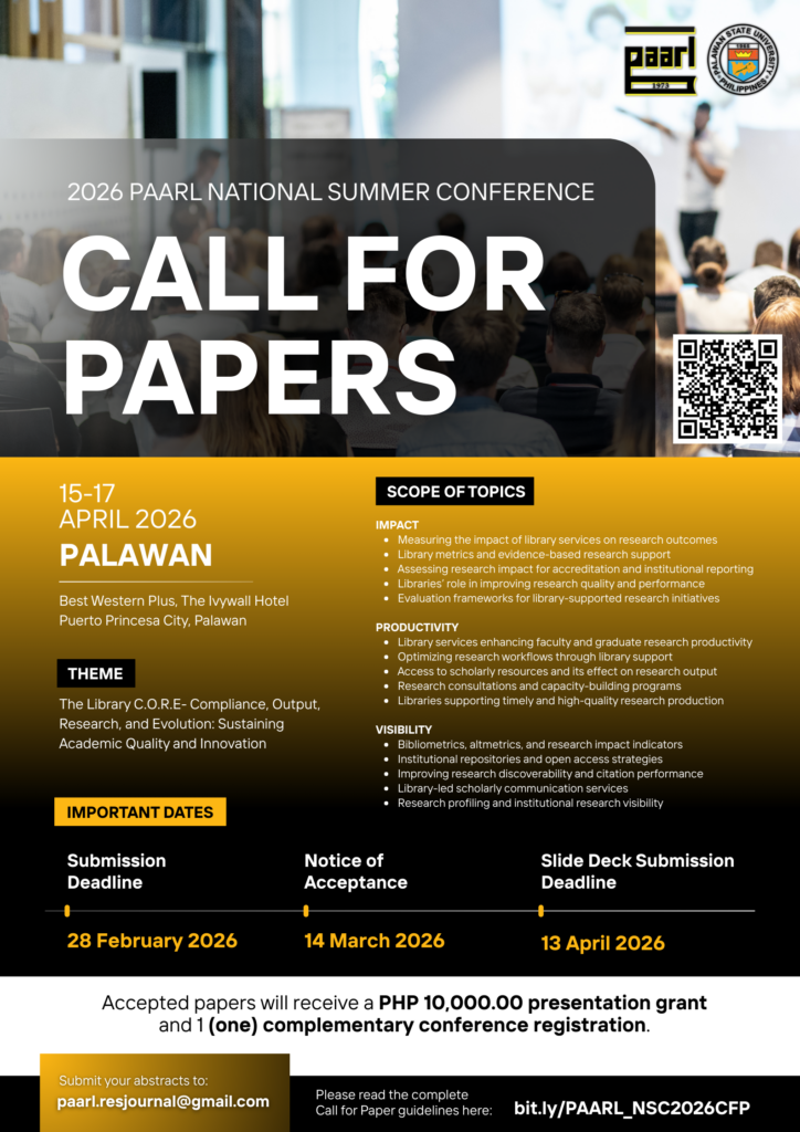 The Philippine Association of Academic/Research Librarians, Inc. (PAARL), in partnership with Palawan State University, is pleased to announce and invite you to the 2026 National Summer Conference, with the theme: “The Library C.O.R.E. – Compliance, Output, Research, and Evolution: Sustaining Academic Quality and Innovation.” The conference will be held from 15–17 April 2026 at Best Western Plus The Ivywall Hotel, Rizal Avenue, Brgy. Bancao-Bancao, Puerto Princesa City, Palawan.